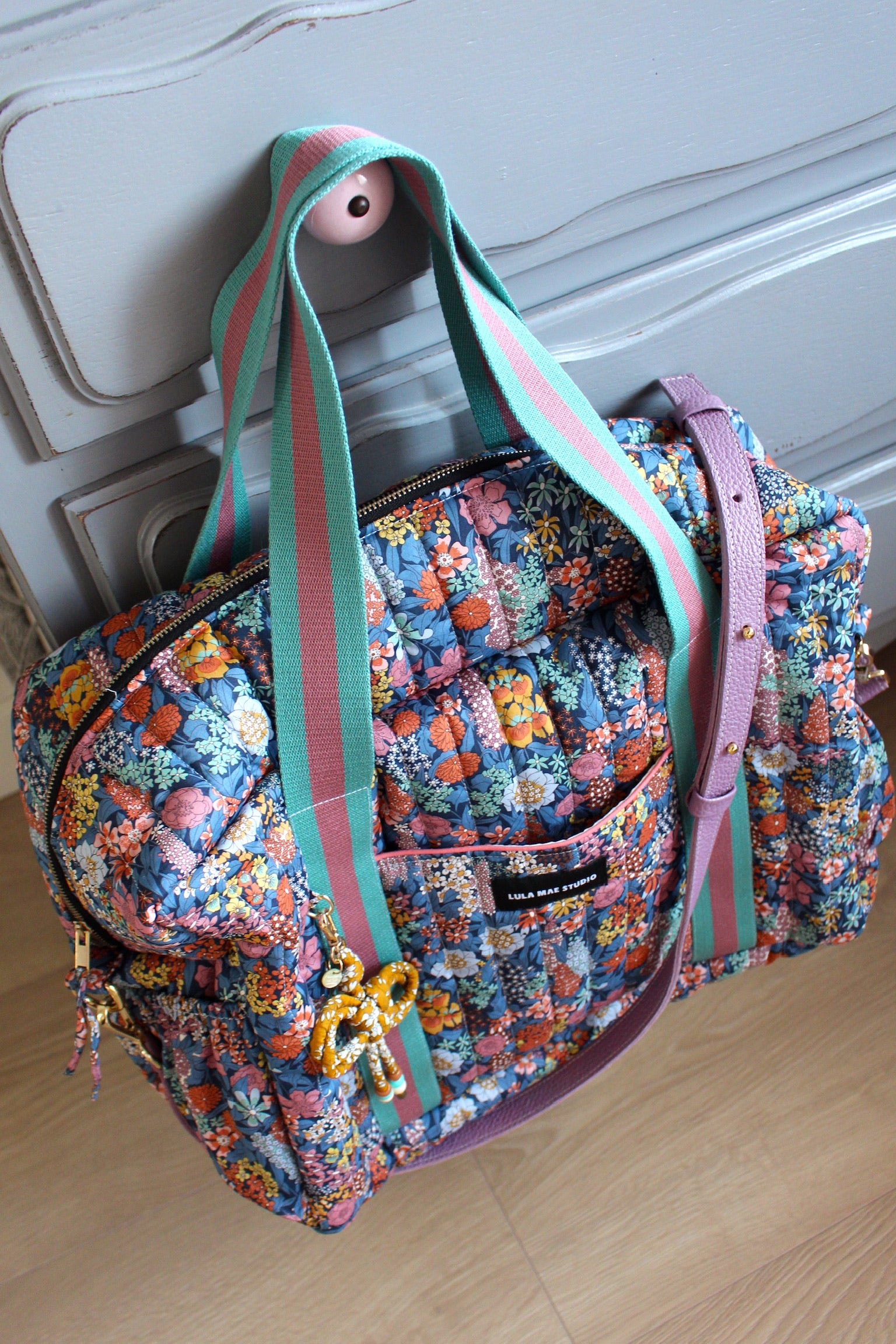 Exterior acolchado e interior con tejido hidrófugo en color crudo. Cremallera con tirador de liberty estampado. Incluye anilla pequeña para colgar el charm decorativo.