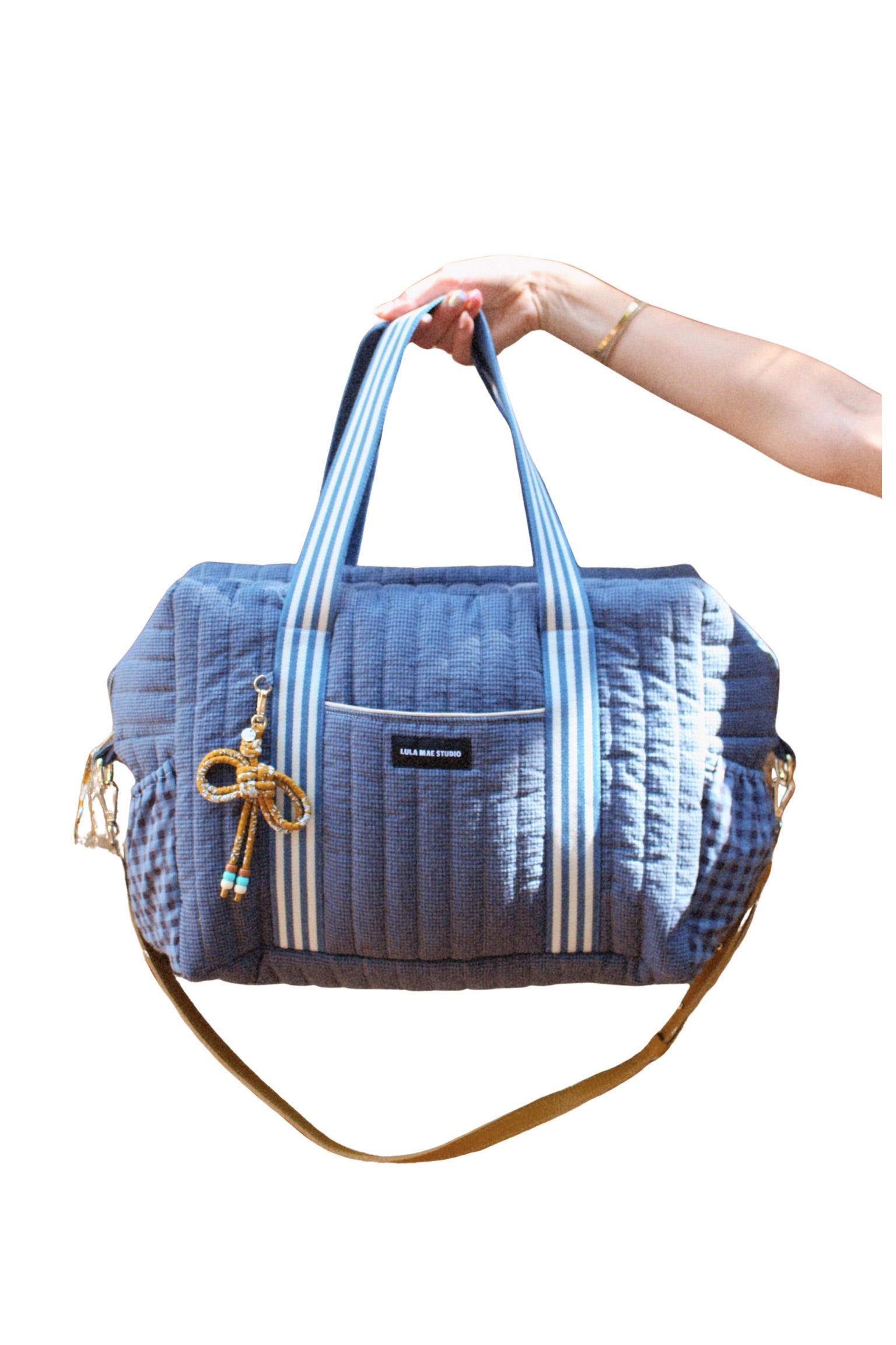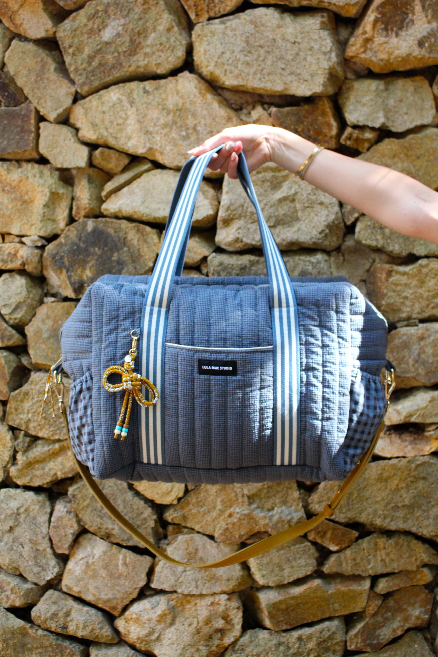 Exterior acolchado e interior con tejido hidrófugo en color crudo. Cremallera con tirador de liberty estampado. Incluye anilla pequeña para colgar el charm decorativo.