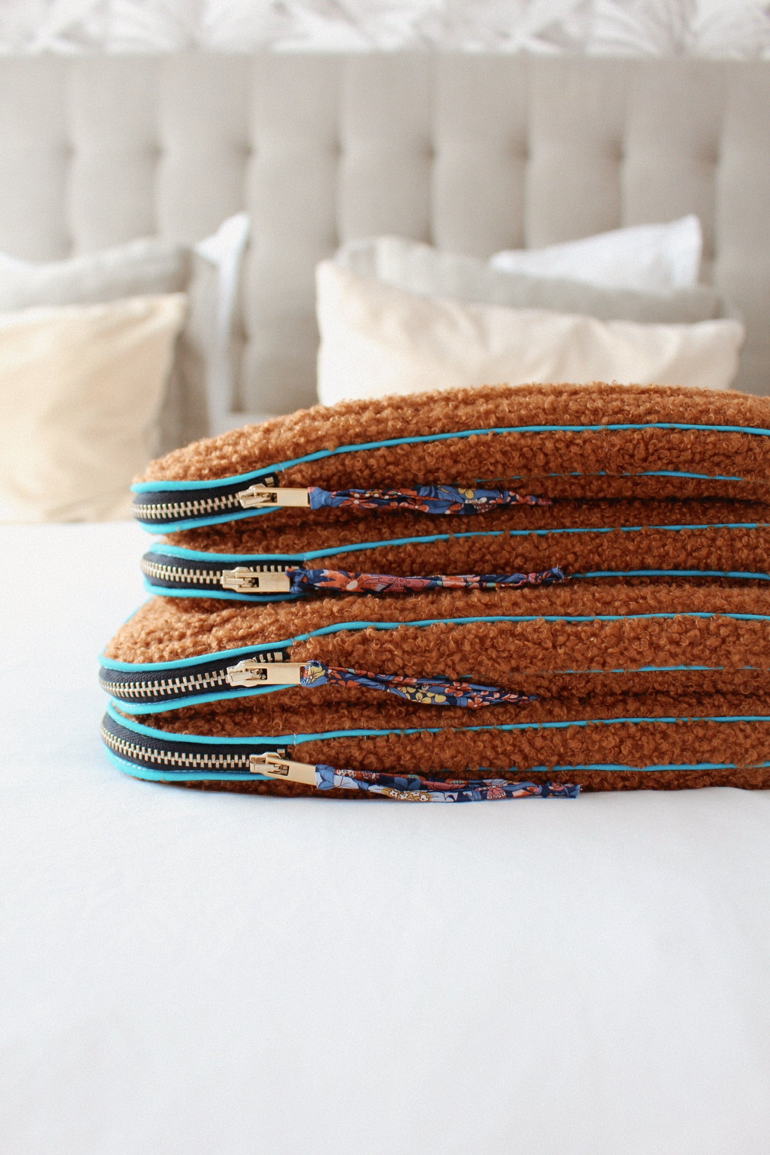 Exterior acolchado e interior en tejido a contraste. Ribete en contorno y tirador en cremallera.